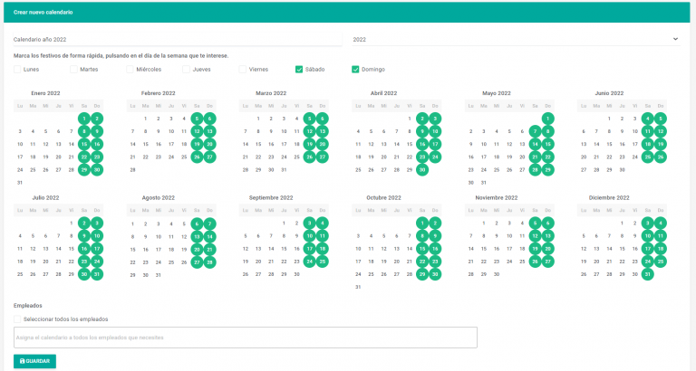 Puedes crear varios si lo necesitas. Marca los días festivos que desees. Bien de manera automática o manualmente haciendo clic en los días que quieras.